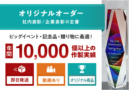 業界最短納期あり!クリスタル製やアクリル製トロフィーに直接加工が出来る。ロゴ入れも可能で企業表彰に大人気!